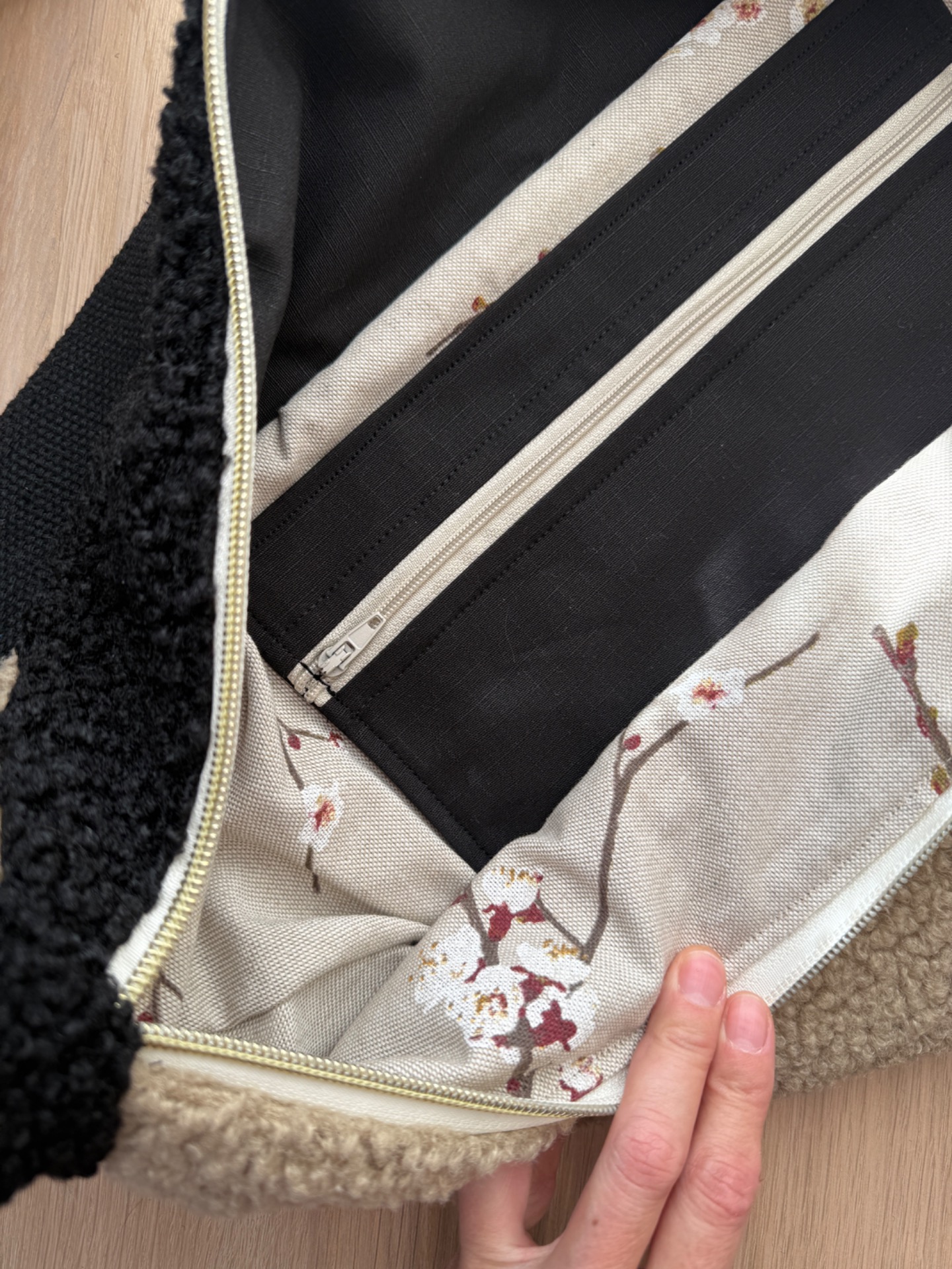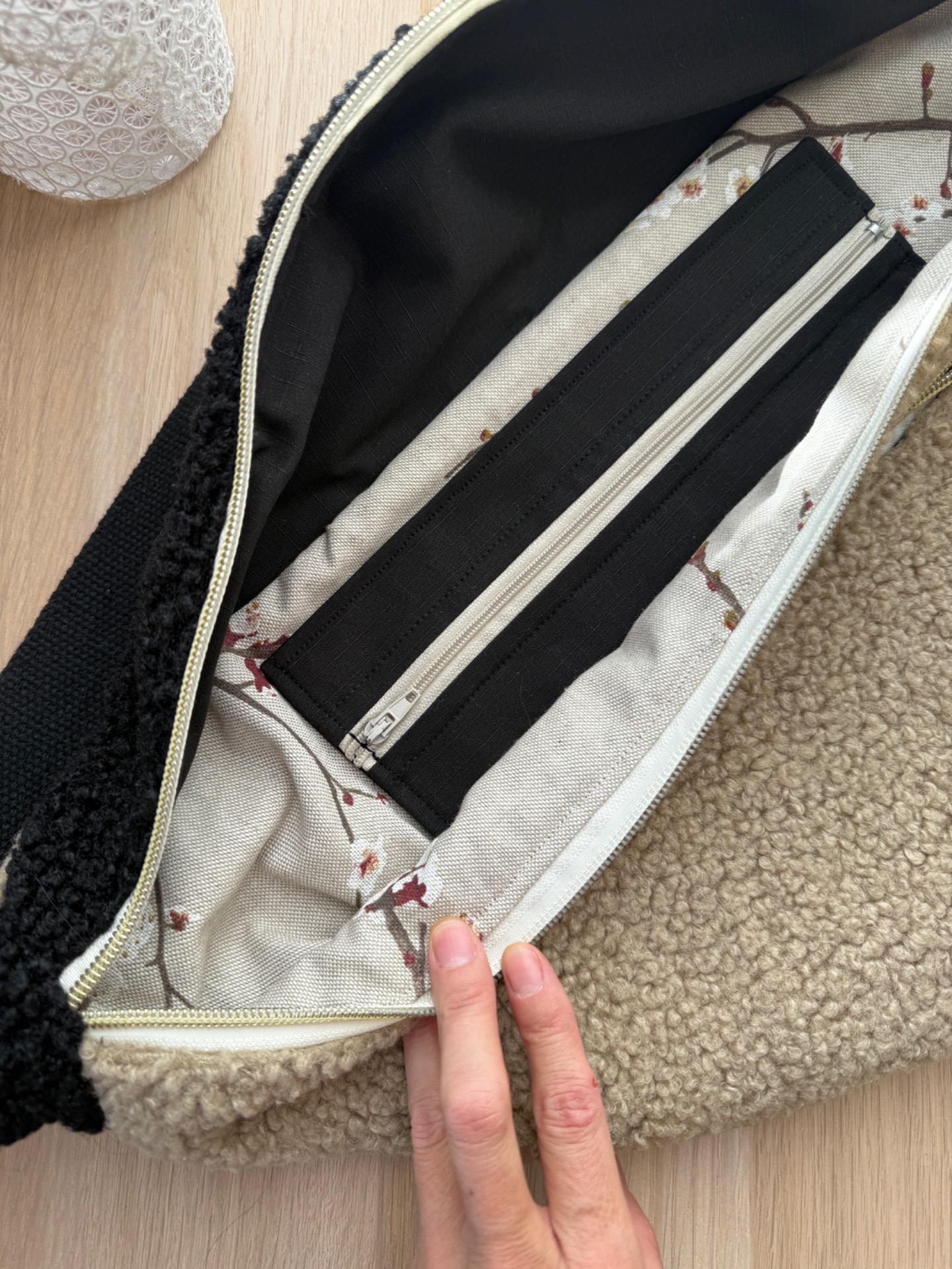La version banana que j'ai créé est un grand format, avec une poche à l'extérieure et une pochette à l'intérieure. Chaque pièce est unique, doublée d'un tissu combiné selon humeur du jour.