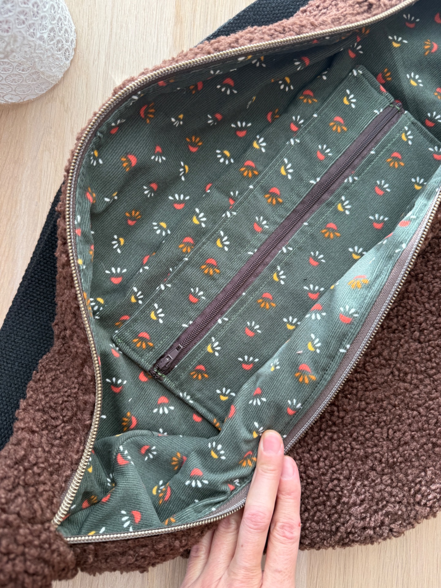 La version banana que j'ai créé est un grand format, avec une poche à l'extérieure et une pochette à l'intérieure. Chaque pièce est unique, doublée d'un tissu combiné selon humeur du jour.
