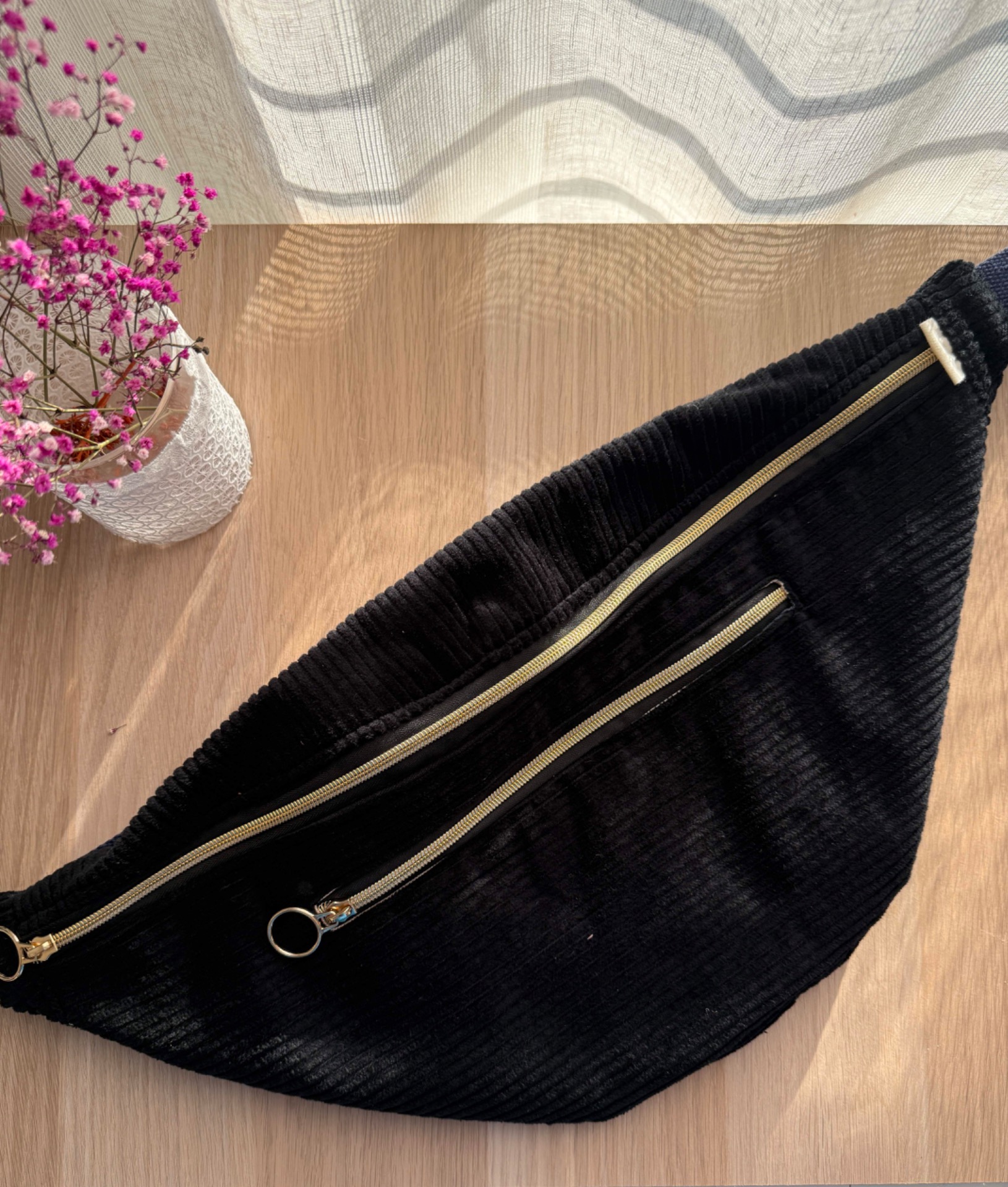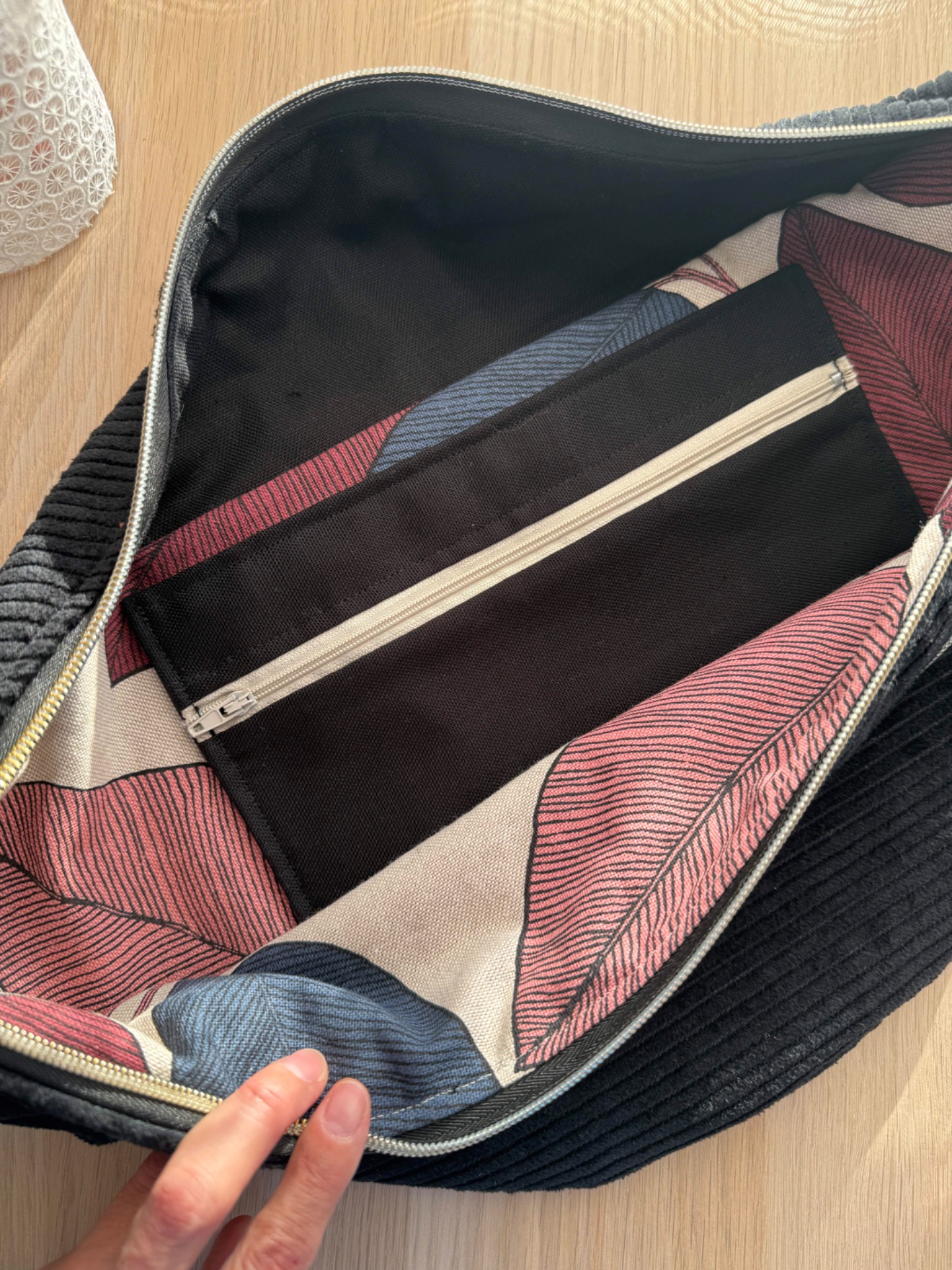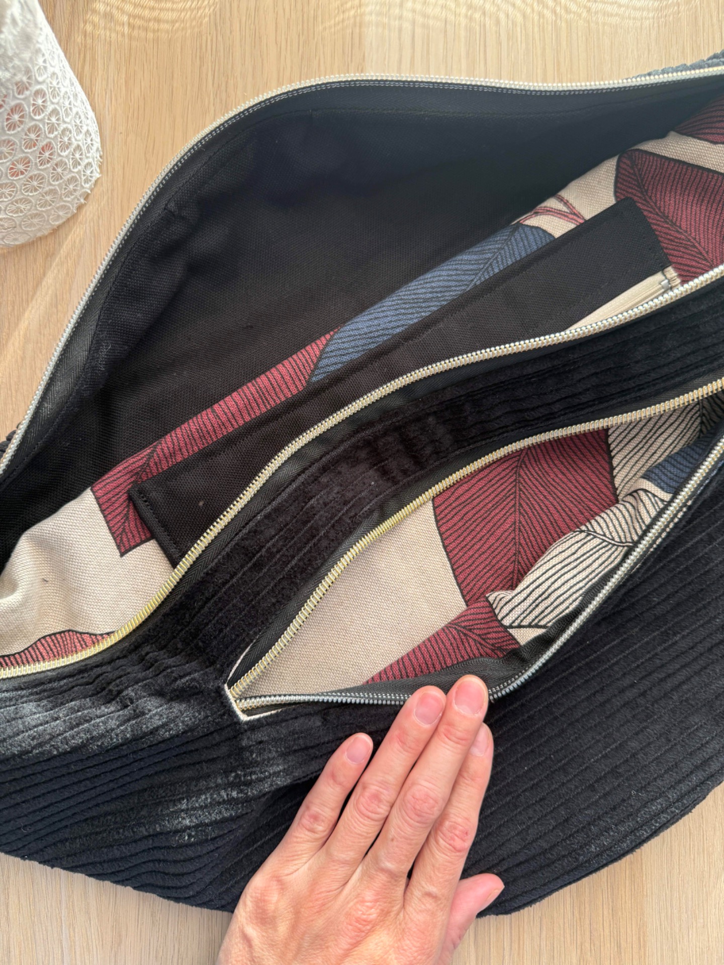 La version banana que j'ai créé est un grand format, avec une poche à l'extérieure et une pochette à l'intérieure. Chaque pièce est unique, doublée d'un tissu combiné selon humeur du jour.