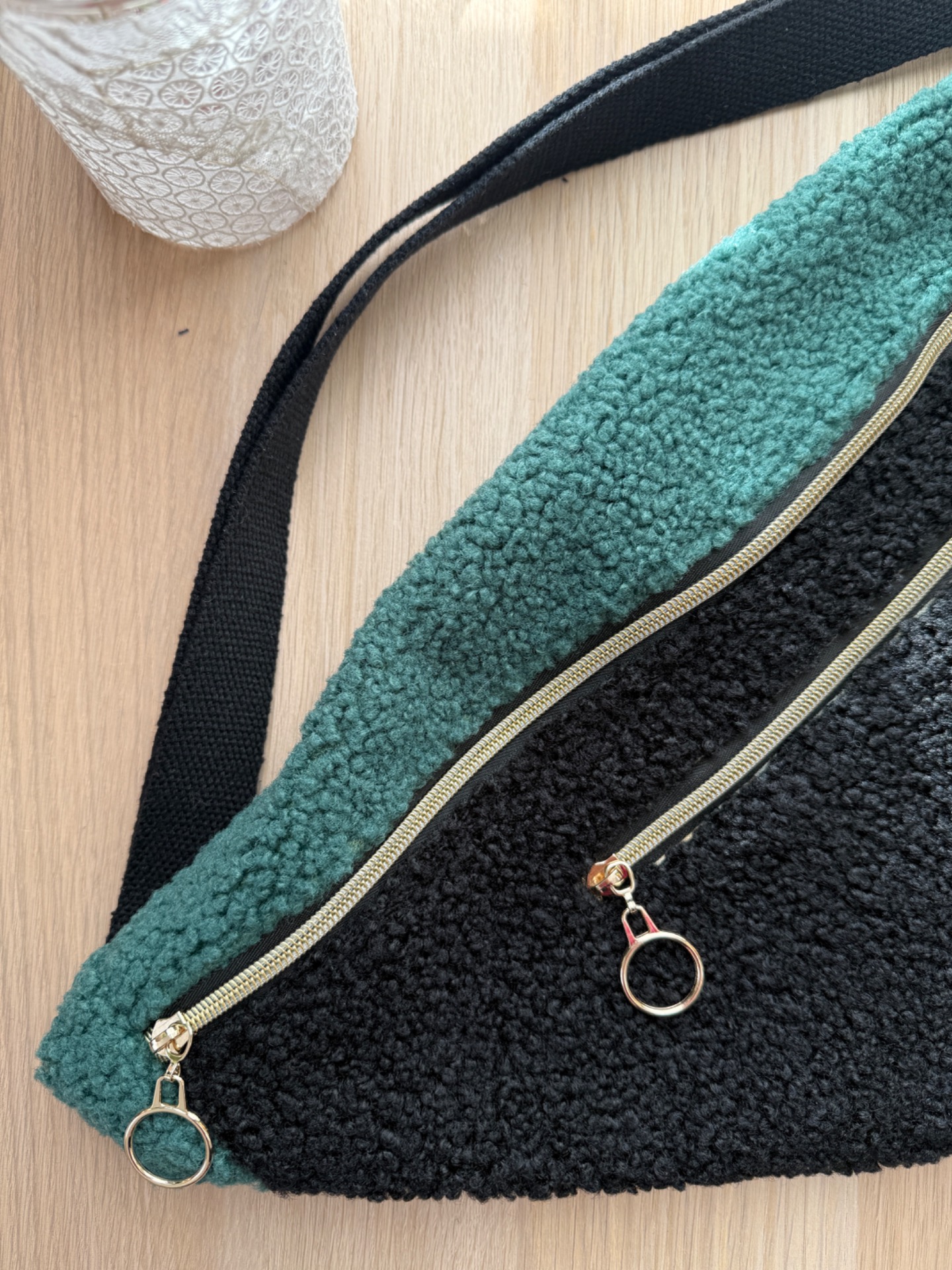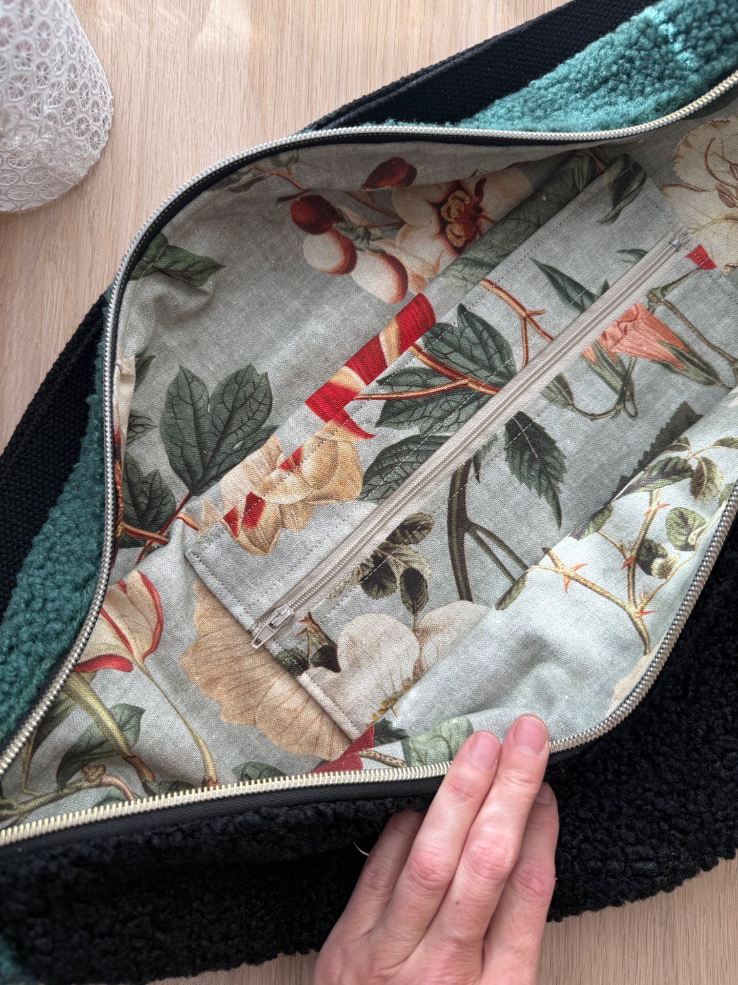 La version banana que j'ai créé est un grand format, avec une poche à l'extérieure et une pochette à l'intérieure. Chaque pièce est unique, doublée d'un tissu combiné selon humeur du jour.