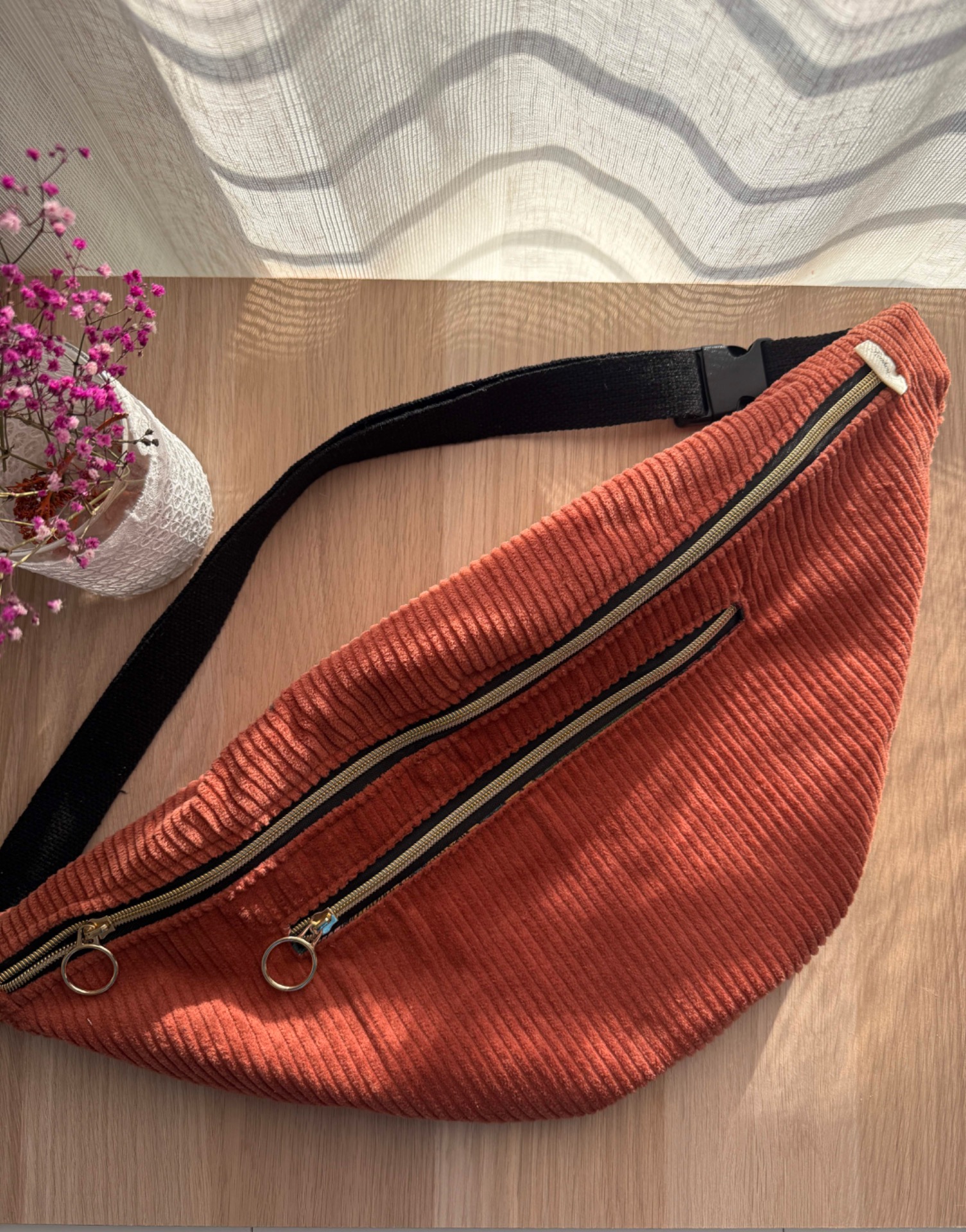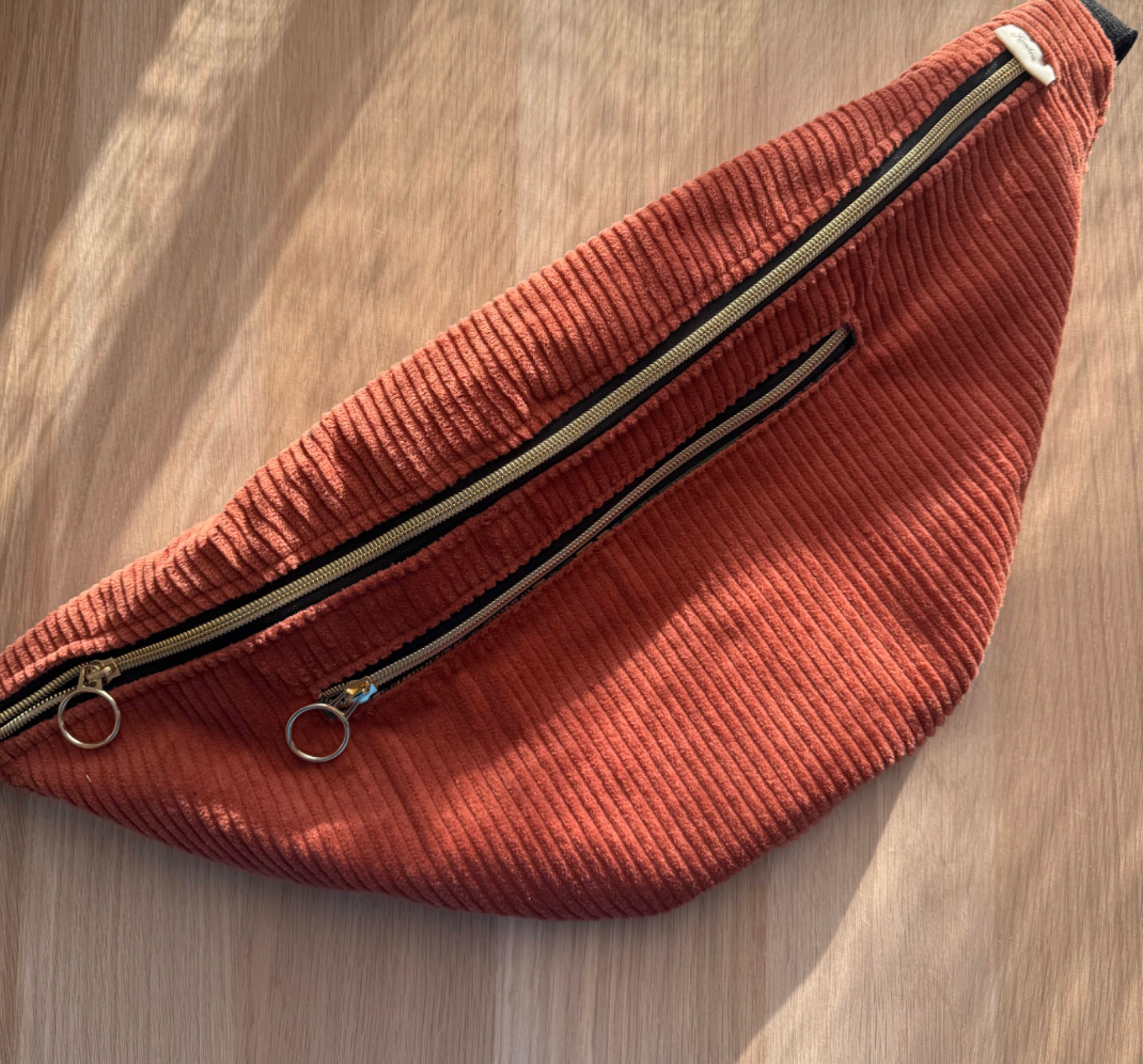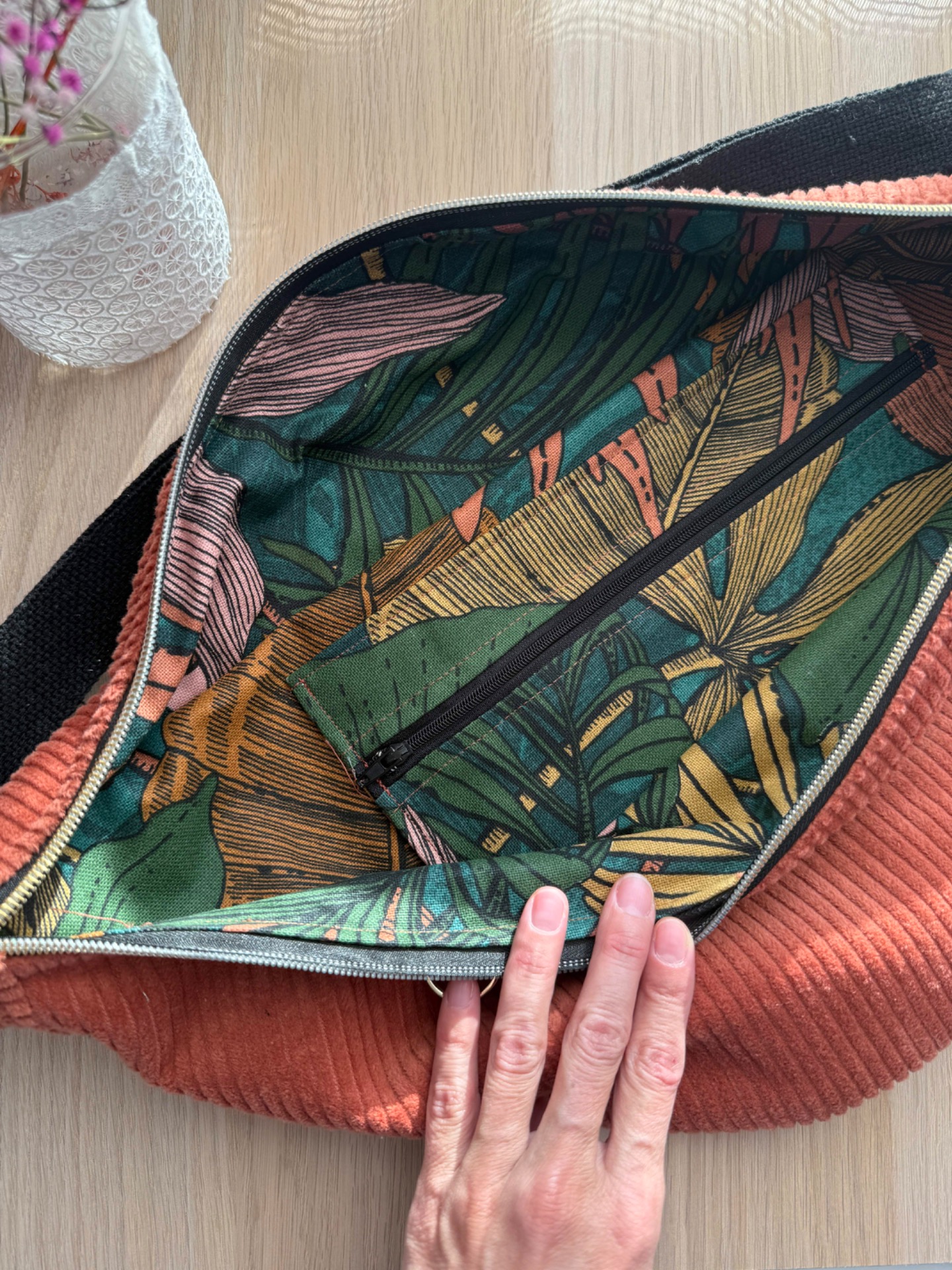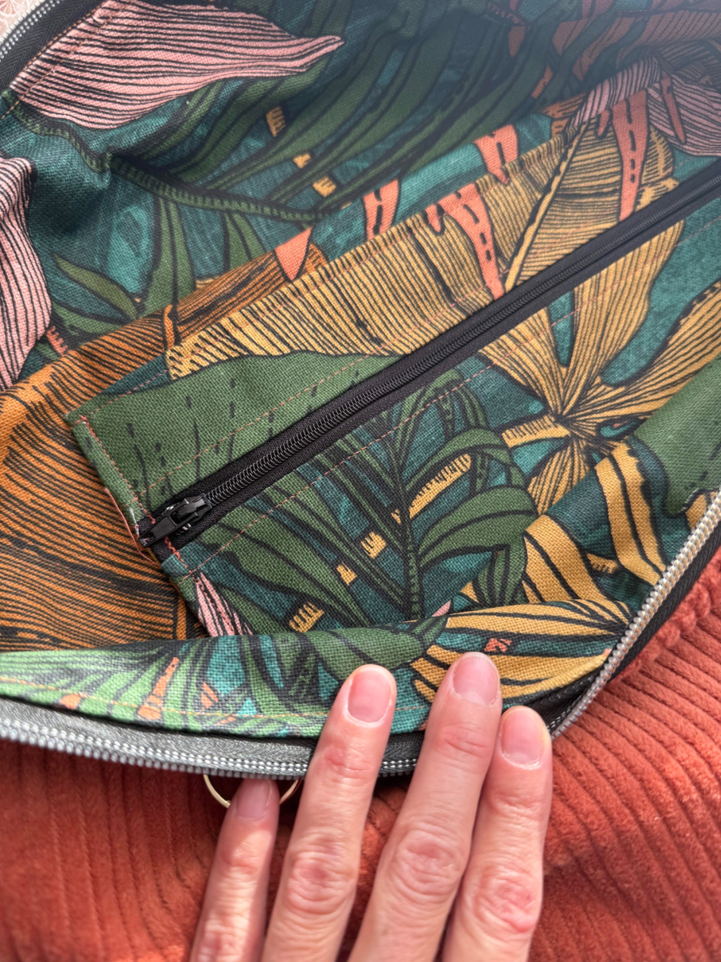 La version banana que j'ai créé est un grand format, avec une poche à l'extérieure et une pochette à l'intérieure. Chaque pièce est unique, doublée d'un tissu combiné selon humeur du jour.